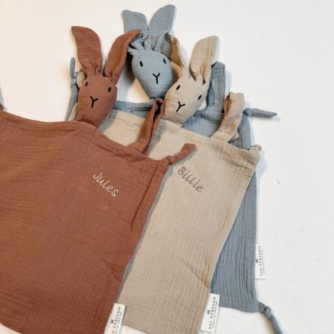 Doudou lapinou à personnaliser en gaze de coton, avec ce petit + qui fait toute la différence; l’attache pour la tétine.