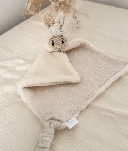Ma lapinette jolie est un doudou fait main dans des tons neutres et doux, c’est une création délicate et adorable, conçue avec soin pour apporter chaleur et réconfort à votre tout-petit. Chaque détail de cette charmante lapinette est réalisé à la main avec amour, le tissu se compose de cette magnifique gaze de coton br