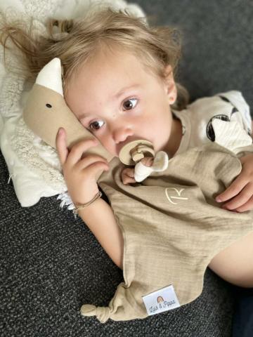 Le doudou Oie Chiffon sera un compagnon idéal pour notre fille ! De forme triangulaire et en matière tétra, il est possible d'y accrocher une tétine sur le coté . Il est parfait pour jouer, mâchouiller, dormir et câliner. Il sera personnalisé avec son joli prénom 🪿