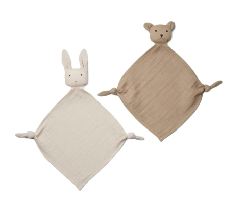 PETIT CHIFFON DOUDOUDoudou doux et réconfortant pour votre bébé. Conçu avec soin pour une utilisation quotidienne durable. Composition: 100% coton biologique lot de 2 - comprenant un ours et un lapin Marqué CE