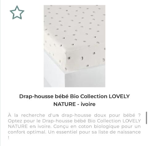 Ce produit est extrait d'une liste de naissance déposée sur Kadolog. Kadolog permet de créer des listes de naissance en toute liberté. Il est possible d'ajouter toutes vos envies cadeaux et de recevoir les dons directement sur votre compte. Avec les dons reçus, vous êtes alors libre d'aller acheter vos produits (comme ce 'Drap housse ') où et quand vous le souhaitez.
