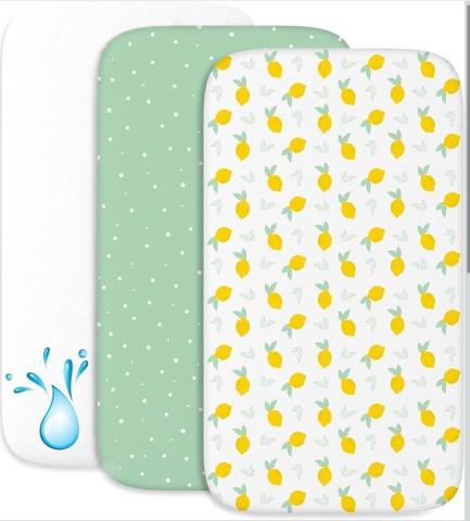 Drap Housse Cododo (Set de 2) + 1 Protège Matelas Impermeable avec Elastique - 3-en-1 - Taille 50x83 cm - Compatible avec Berceaux, Lit Matelas Cododo Bebe - pour Fille et Garçon - Motif Citron