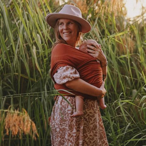 Notre écharpe élastique rouge rouille est votre compagnon idéal au quotidien et convient parfaitement à porter dès la naissance.