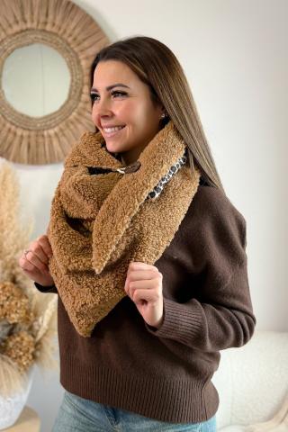 Echarpe bi matières En triangle Un côté teddy L'autre en style velours S'attache avec un bouton Matière : 100% Viscose Disponible à Gembloux