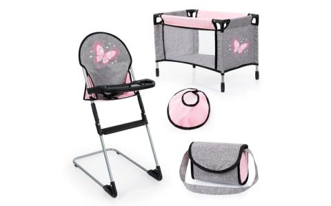 Faites le bonheur d'une mini maman ou d'un mini papa avec ce joli ensemble : un lit, une chaise haute, un sac à langer et un bavoir. En bref, tout ce dont