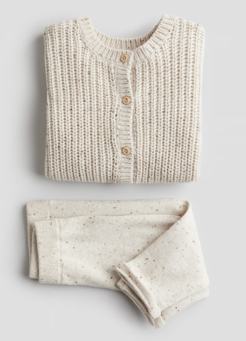 Ensemble en maille de coton doux, composé d'un gilet et d'un pantalon assorti. Gilet avec encolure ronde et boutonnage devant. Finitions côtelées. Pantalon avec élastique à la taille et finition côtelée en bas de jambe.