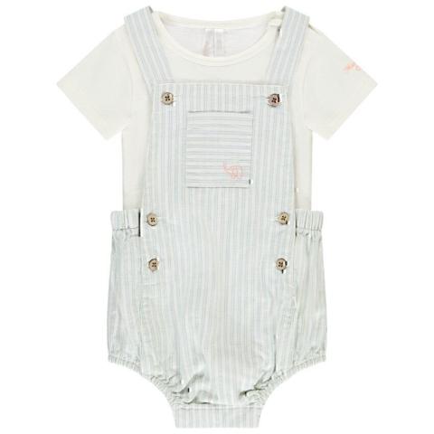 Barboteuse en toile. Rayures contrastées all-over. Bretelles boutonnées ajustables sur deux hauteurs à l'avant et croisées dans le dos. Boutons coco. Poche plaquée avec éléphant en surpiqûres sur le devant. Rétention élastique sur les côtés de la taille et à l'arrière. Ouverture boutonnée à l'avant avec étiquette printée cœur. Entrejambe pressionné en liquette.