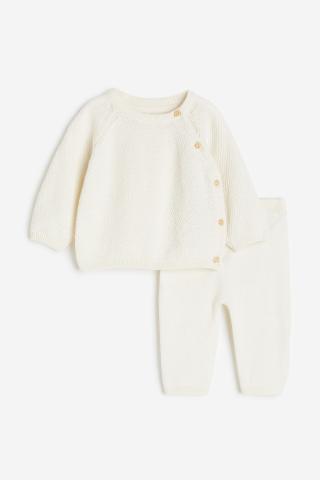 Ensemble composé d’un pull en maille texturée et d’un pantalon en douce maille de coton. Pull avec encolure ronde et longues manches raglan. Boutonnage sur une épaule, se prolongeant sur un côté. Fini...
