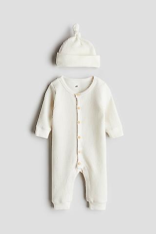 Ensemble en jersey de coton gaufré, composé d'une combinaison et d'un bonnet.