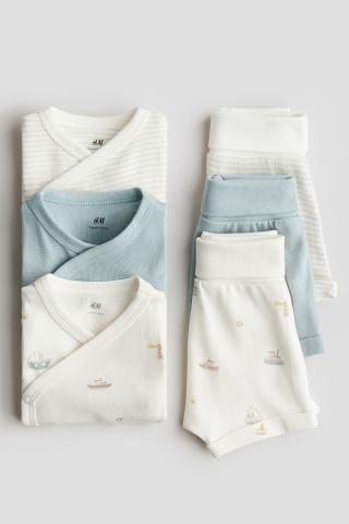 Ensemble en jersey de coton doux, composé de trois bodies et de trois shorts. Bodies à manches courtes avec fermeture croisée devant, maintenue par boutons-pression sur les côtés. Entrejambe pressionné. Shorts avec élastique à la taille.