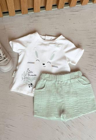 Ensemble bébé t-shirt et short en gaze de coton frimousse vert - Dans de jolis tons frais d'été, votre petit bout se sentira à l'aise dans des matières légères et douces. Un joli ensemble conçu pour les petites frimousses ave