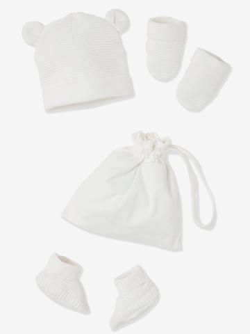 Un ensemble essentiel pour les premiers jours de bébé. Ce kit en maille toute douce est idéal pour la peau fragile de bébé. Il comprend : un bonnet, des gants et des chaussons pour