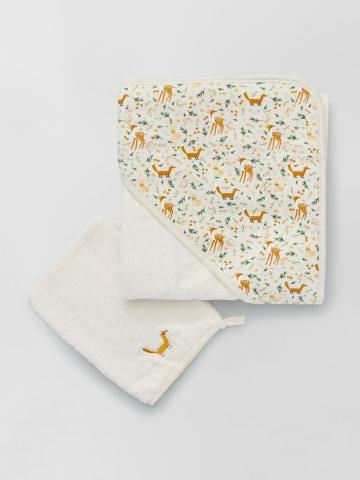 Le kit essentiel pour les bains de bébé. - Cape de bain - 100% coton - En éponge - Avec capuche - Broderie fantaisie à l'avant - Imprimé 'animaux de la forêt' all over - Gant de toilette assorti