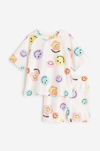 Ensemble de bain en textile protégeant des UV, composé d'un haut et d'un short. Haut à petit col droit avec courtes manches à découpe raglan pour réduire le risque de frictions dues aux coutures. Shor...