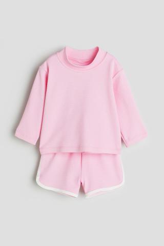 Ensemble de bain en textile protégeant des U.V., composé d'un haut et d'un short. Haut avec petit col droit et manches longues. Short doublé avec élastique habillé à la taille. Bord arrondi et fente l...