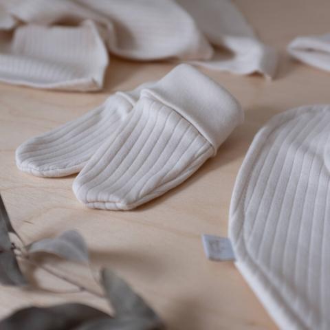 Magnifique ensemble de mitaines et chapeau en coton organique pour protéger les petites mains de votre nouveau-né et garder leur tête bien au chaud.