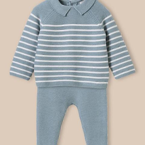 Cap sur la douceur avec cet ensemble de naissance en point mousse, rayé dans un esprit marin. Petit col Ouverture dos par boutons en bois Taille élastiquée