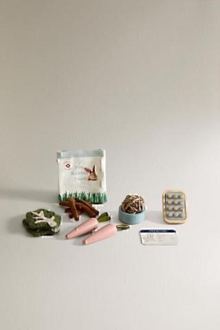 Ensemble de jouets avec tous les accessoires nécessaires pour prendre soin du lapin : nourriture incluse, peigne, jouet et fiche avec toutes ses informations.