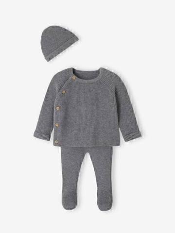 Ensemble naissance 3 pièces en tricot gilet + pantalon + bonnet gris chiné -
