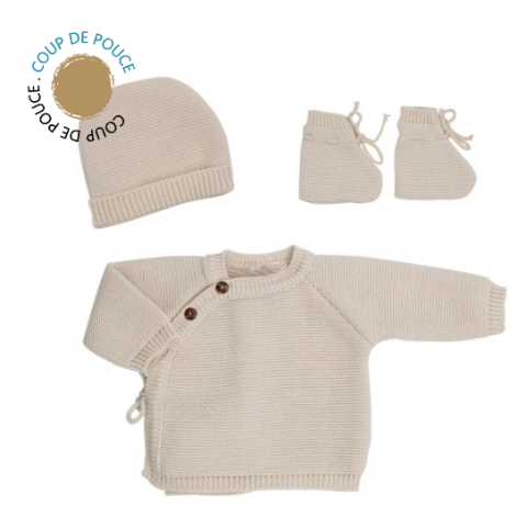 Craquez pour le kit naissance bébé sable 0/1 mois Trois Kilos Sept. Il se compose d'une brassière, d'un bonnet et de chausson bébé. Livraison rapide ......