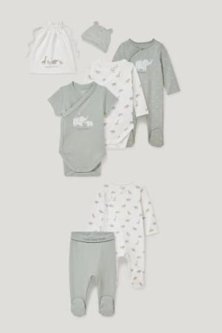 Deux pyjamas, deux bodies croisés devant, un bonnet, un pantalon avec pied et un sac pour tout ranger - taille 56 (1/2 mois)