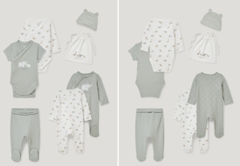 Ensemble nouveau-né en jersey, orné d’animaux du zoo. Deux pyjamas et un pantalon avec des pieds. Deux bodys croisés et un bonnet. Sac de cadeaux compris, permettant de ranger tout l’ensemble.