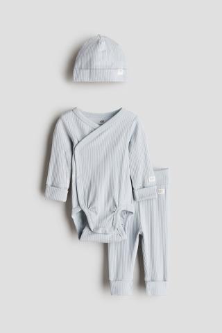 Ensemble évolutif en jersey de coton doux, composé d'un body, d'un pantalon et d'un bonnet. Body avec fermeture croisée devant, maintenue par boutons-pression sur les côtés, et manches longues terminées par poignet dépliable de très grande longueur permettant de s'adapter à la croissance de bébé. Deux rangs de boutons-pression à l'entrejambe pour ajuster la longueur et coutures froncées autour des jambes pour plus de confort et un meilleur ajustement au niveau de la couche. Pantalon avec large ceinture repliable à la taille et bord de très grande longueur en bas de jambe. Bonnet avec bord replié.