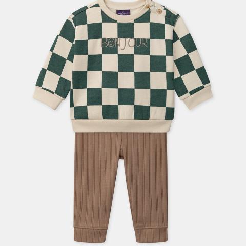 Pour les petits actifs de l’automne, cet ensemble associe confort et style. Le sweat à carreaux écru et vert foncé, orné d’une inscription brodée “Bonjour”, s’enfile facilement grâce à son ouverture par boutons au col. Le legging marron clair côtelé, avec sa taille élastiquée et ses cordons décoratifs, complète ce look