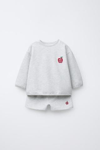Ensemble deux pièces. Sweat-shirt à col rond et manches longues. Finitions côtelées. Fermeture à boutons-pression sur l'épaule. Bermuda avec ceinture élastique. Application pièce pomme.