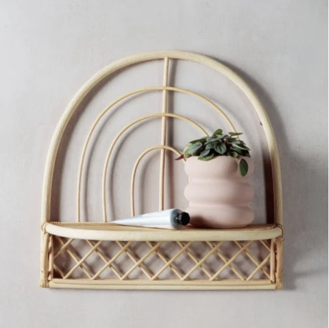 Magnifique étagère en rotin, en forme d'arc en ciel. Elle décorera parfaitement une chambre d'enfant, ou tout autre pièce. Avec sa couleur naturelle, elle s'assortira facilement avec toutes les décorations.