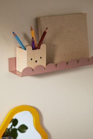 Étagère murale en métal à la finition satinée avec bord festonné. Trous de suspension sur l'arrière. Visserie non incluse. Hauteur 5 cm. Profondeur 9 cm. Longueur 35 cm.