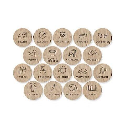 Nous avons trouvé ces belles étiquettes de rangement en bois à coller sur les bacs à jouets des filles! 🧸