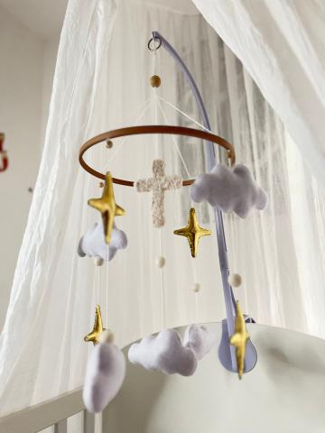 Découvrez le mobile Etoile de Béthléem, un éveil à la foi pour votre enfant, alliant symboles chrétiens et apaisement.