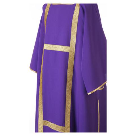 L'étole et la dalmatique sont les ornements liturgiques du diacre. Le violet sert aux temps de pénitence (Avent, Carême) et pour les enterrements.