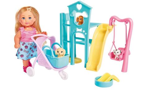 Evi profite du beau temps avec ses chiots sur le terrain de jeu pour chiens ! Amuse-toi avec eux !Contenu• 1 poupée• 3 chiots• 1 buggy pour transporter les