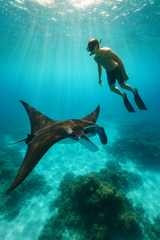 Partez tôt le matin en bateau pour rejoindre les eaux cristallines où évoluent les majestueuses raies manta, créatures mythiques de l’océan