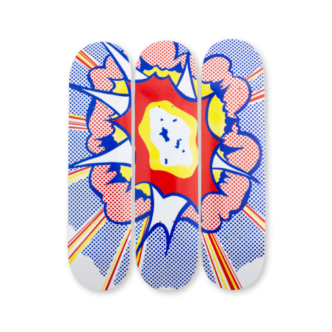 Un triptyque de Roy LICHTENSTEIN et THE SKATEROOM. Via ces créations, the Skateroom soutient différent programmes d'apprentissages pour des jeunes de milieux défavorisés.