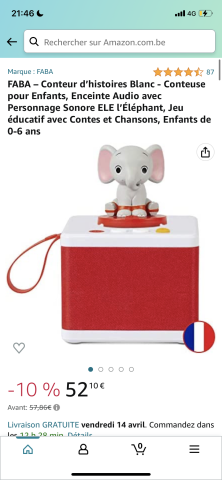 Ce produit est extrait d'une liste de cadeaux (Anniversaire, Noël, ...) déposée sur Kadolog. Kadolog permet de créer des listes de cadeaux (Anniversaire, Noël, ...) en toute liberté. Il est possible d'ajouter toutes vos envies cadeaux et de recevoir les dons directement sur votre compte. Avec les dons reçus, vous êtes alors libre d'aller acheter vos produits (comme ce 'FABA – Conteur d’histoires Blanc - Conteuse pour Enfants, Enceinte Audio avec Personnage Sonore ELE l’Éléphant, Jeu éducatif avec Contes et Chansons, Enfants de 0-6 ans ') où et quand vous le souhaitez.