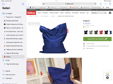 Ce produit est extrait d'une liste de cadeaux (Anniversaire, Noël, ...) déposée sur Kadolog. Kadolog permet de créer des listes de cadeaux (Anniversaire, Noël, ...) en toute liberté. Il est possible d'ajouter toutes vos envies cadeaux et de recevoir les dons directement sur votre compte. Avec les dons reçus, vous êtes alors libre d'aller acheter vos produits (comme ce 'Fatboy ') où et quand vous le souhaitez.