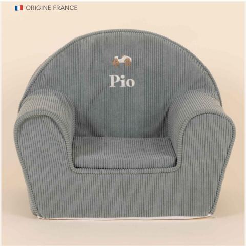 Joli fauteuil club velours côtelé vert de gris. Origine France, personnalisez le au prénom de l'enfant pour un cadeau unique.