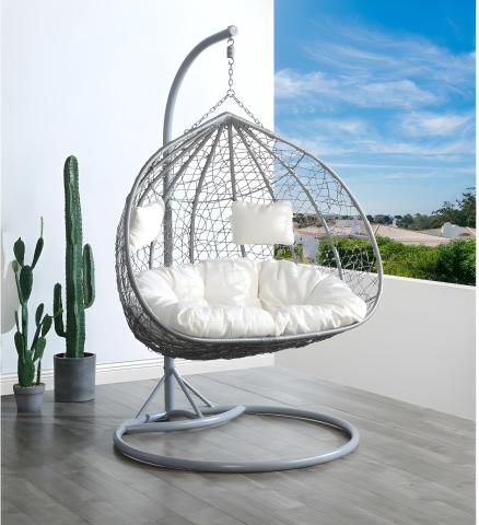 Fauteuil suspendu 2 places CAYAMBE résine tressée -Coloris: Gris et coussins blancs -Dim: D120 X H204cm -