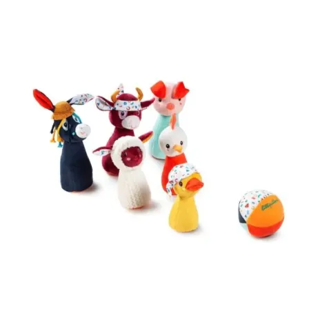 Ce jeu de quilles classique aux animaux de la ferme tout doux est idéal pour jouer à la balle à l'intérieur … pour stimuler la coordination yeux-mains et la maîtrise de la balle.