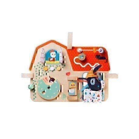 Ce panneau en bois représentant une ferme est riche en activités et matières pour stimuler les petits dans leurs découvertes. Les jolies illustrations racontent l’histoire des animaux de la ferme. Se fixe facilement au parc grâce aux rubans velcro.