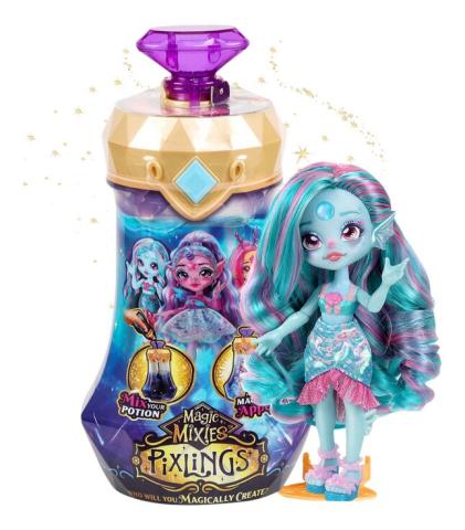 Ajoute les ingrédients magiques et regarde ton élixir devenir d'un bleu profond à l'intérieur de la bouteille, puis tourne et appuie sur le bouchon en cristal... pour voir apparaître une sirène Magic Mixies Pixlings !