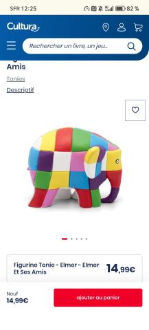 Ce produit est extrait d'une liste de cadeaux (Anniversaire, Noël, ...) déposée sur Kadolog. Kadolog permet de créer des listes de cadeaux (Anniversaire, Noël, ...) en toute liberté. Il est possible d'ajouter toutes vos envies cadeaux et de recevoir les dons directement sur votre compte. Avec les dons reçus, vous êtes alors libre d'aller acheter vos produits (comme ce 'Figurine Tonie - Elmer - Elmer Et Ses Amis - Boîtes à  histoires - Jeux d'éveil | Cultura ') où et quand vous le souhaitez.