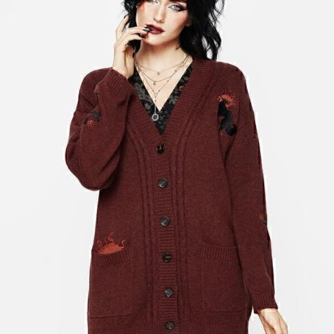 Run with the foxes- Burgundy red floral fox embroidered knit cardigan - Relaxed fit & stretchy knit for comfortable styling - Rounded neckline & cosy long sleeves - Button-up front fastening features mock horn buttons - Two patch pockets for essentials - Rich burgundy red knitted fabrication - Orang