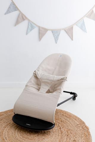 Dale un aire distinto a la hamaca Babybjorn con nuestra funda en lino tostado. Sustituye a la original. Personalizable con el nombre.