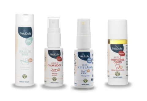Gamme qui comprend un gel lavant extra doux, une huile qui apaise les gencives lors des poussées dentaires, une huile de massage apaisante pour le bidou et une huile pour les petits câlins.