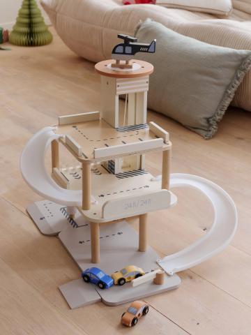 Un garage en bois avec 3 niveaux, un ascenseur, un toboggan, une station essence et une aire de lavage ! Un jouet complet pour les petits passionnés de voitures !