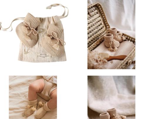 Chaussons en tricot et pochon brodé - Beige. pour garder les pieds au chaud